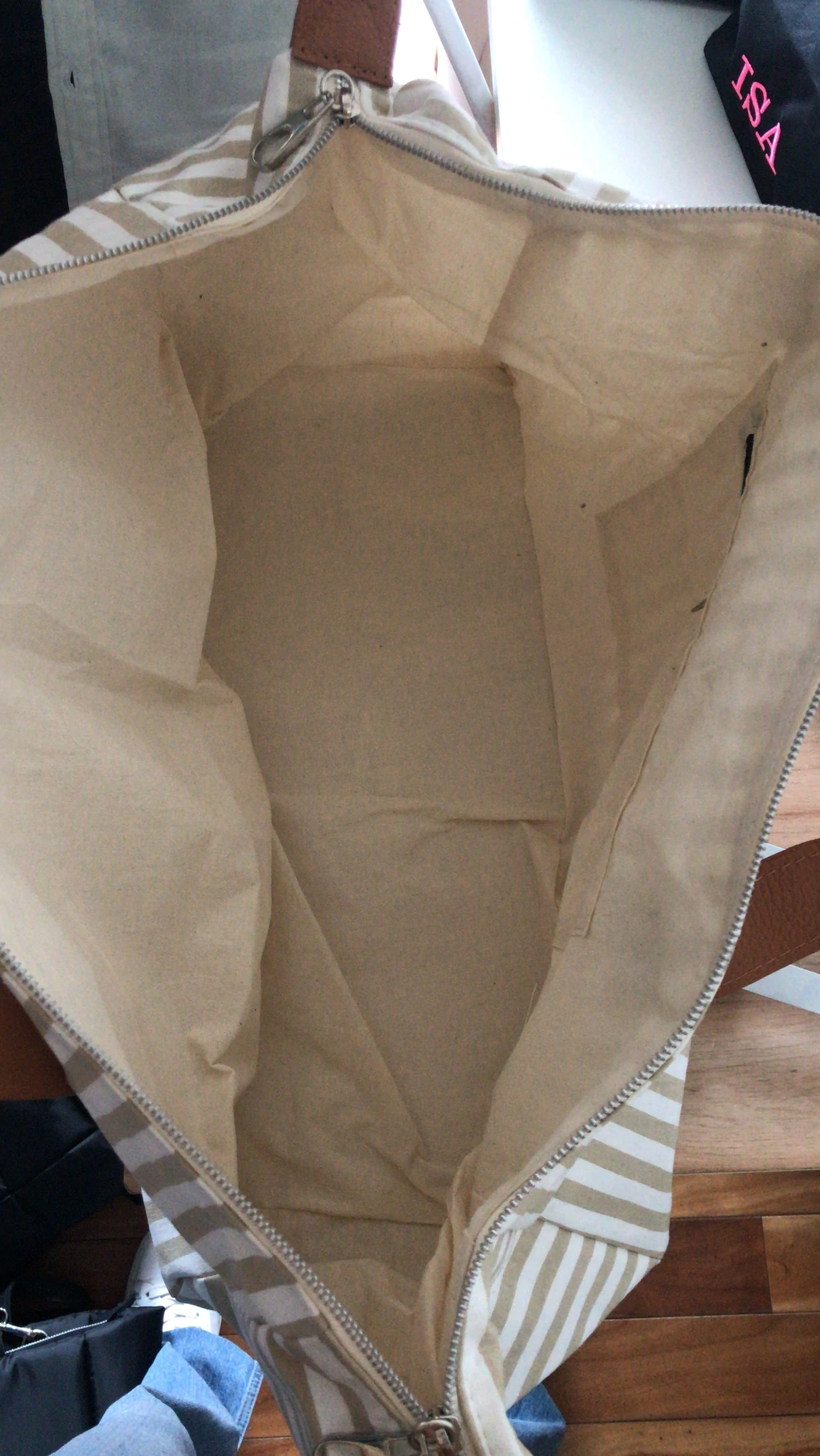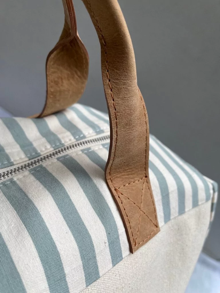 Bolso de Tusor 100% algodón, forrado con manijas de cuero y bolsillo interno.