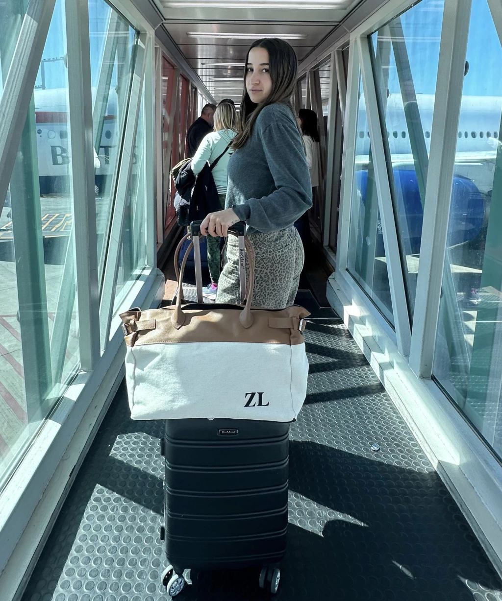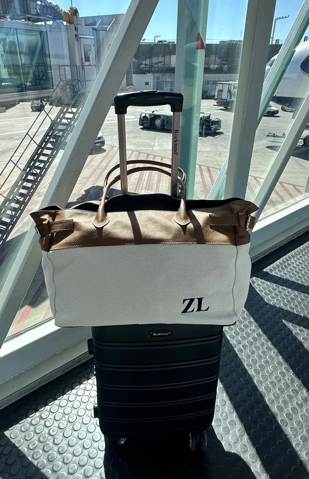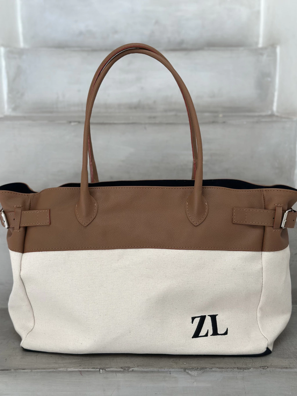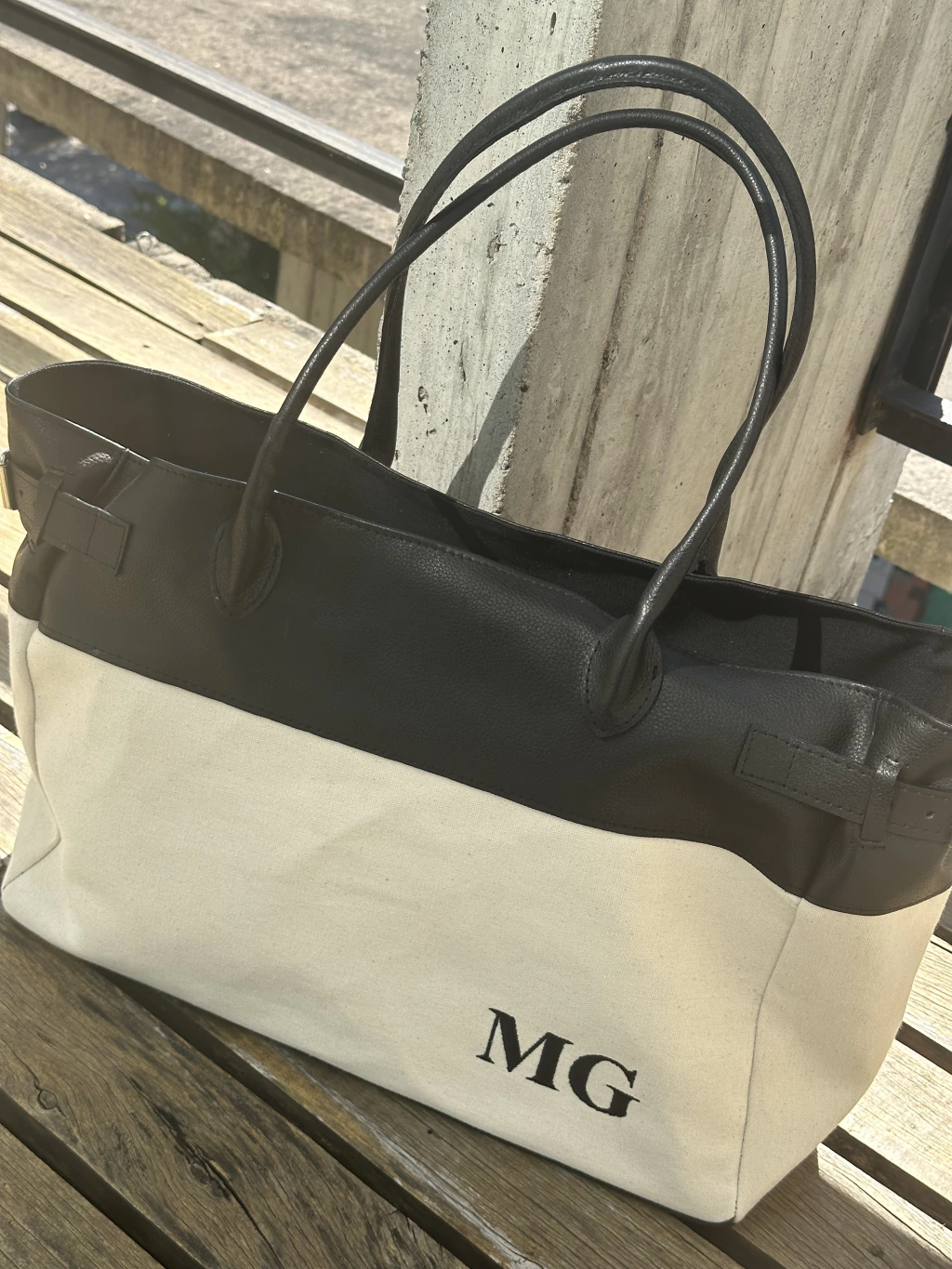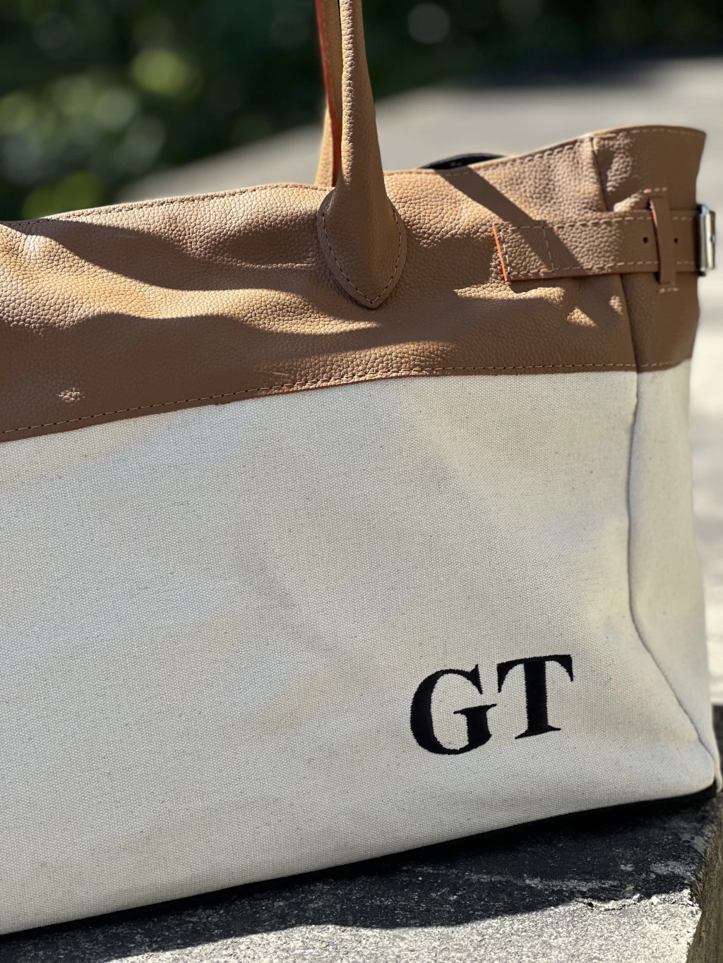 Cuenta con un cierre metálico resistente que asegura tus pertenencias, mientras que sus detalles y manijas en cuero le aportan un toque sofisticado y duradero. Además, podés personalizarlo con letras bordadas (máximo 5 letras), haciendo que tu bolso sea único y especial.