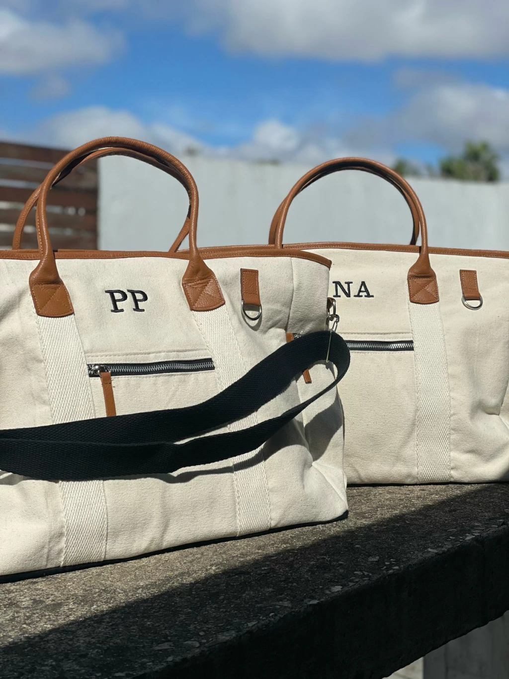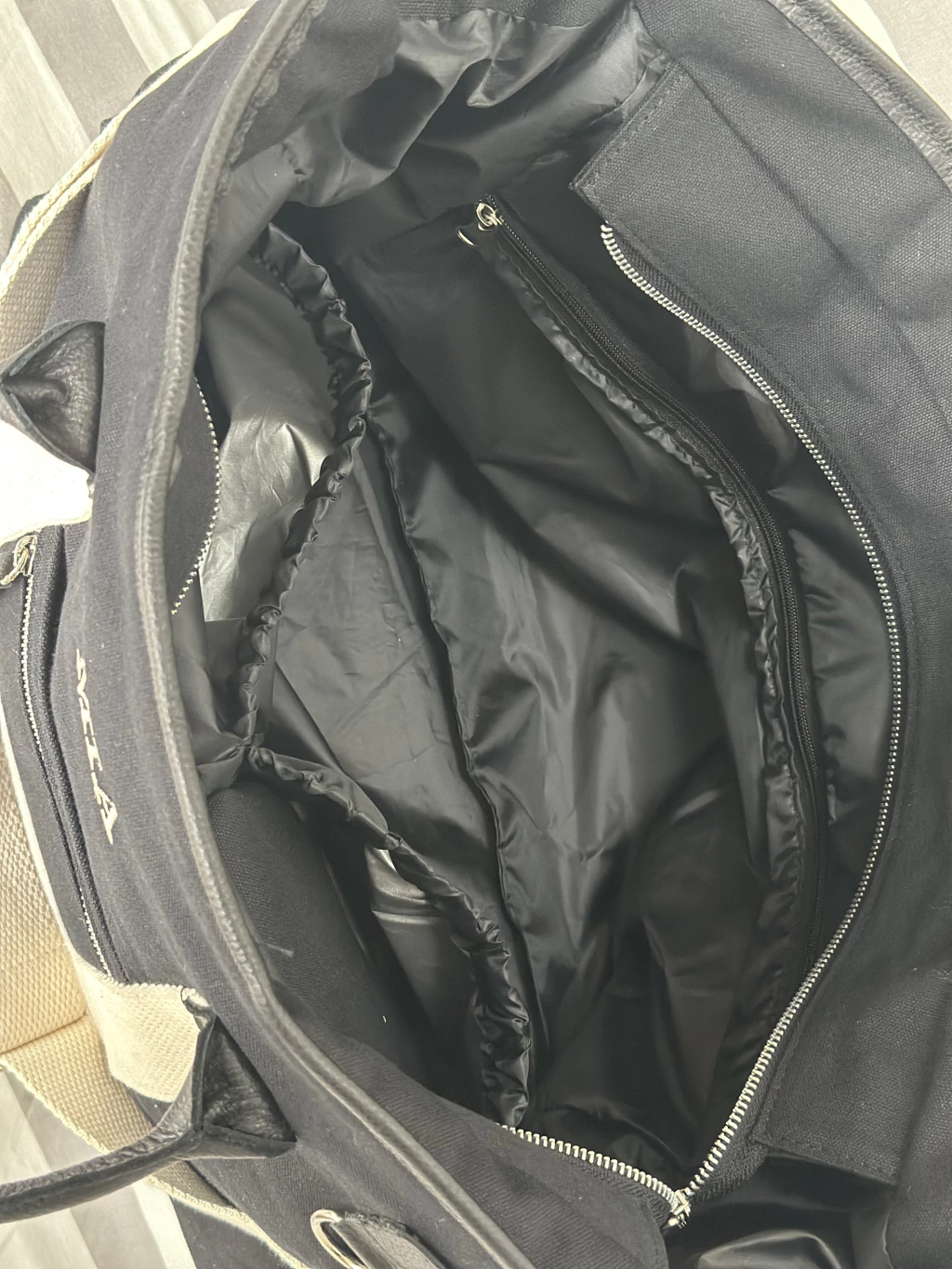 En lona con detalles en cuero y cintas de algodón . Forrado con tela impermeable negro, tiene dos guanteras de un lado y del otro bolsillo grande con cierre de lado a lado. Cierra con cierre metálico . deMedidas 44cm ancho, 33 de alto, 17 profundidad, manijas de 47cm , correa larga de 1,20cm regulable . Base de 44cm x 17cm
