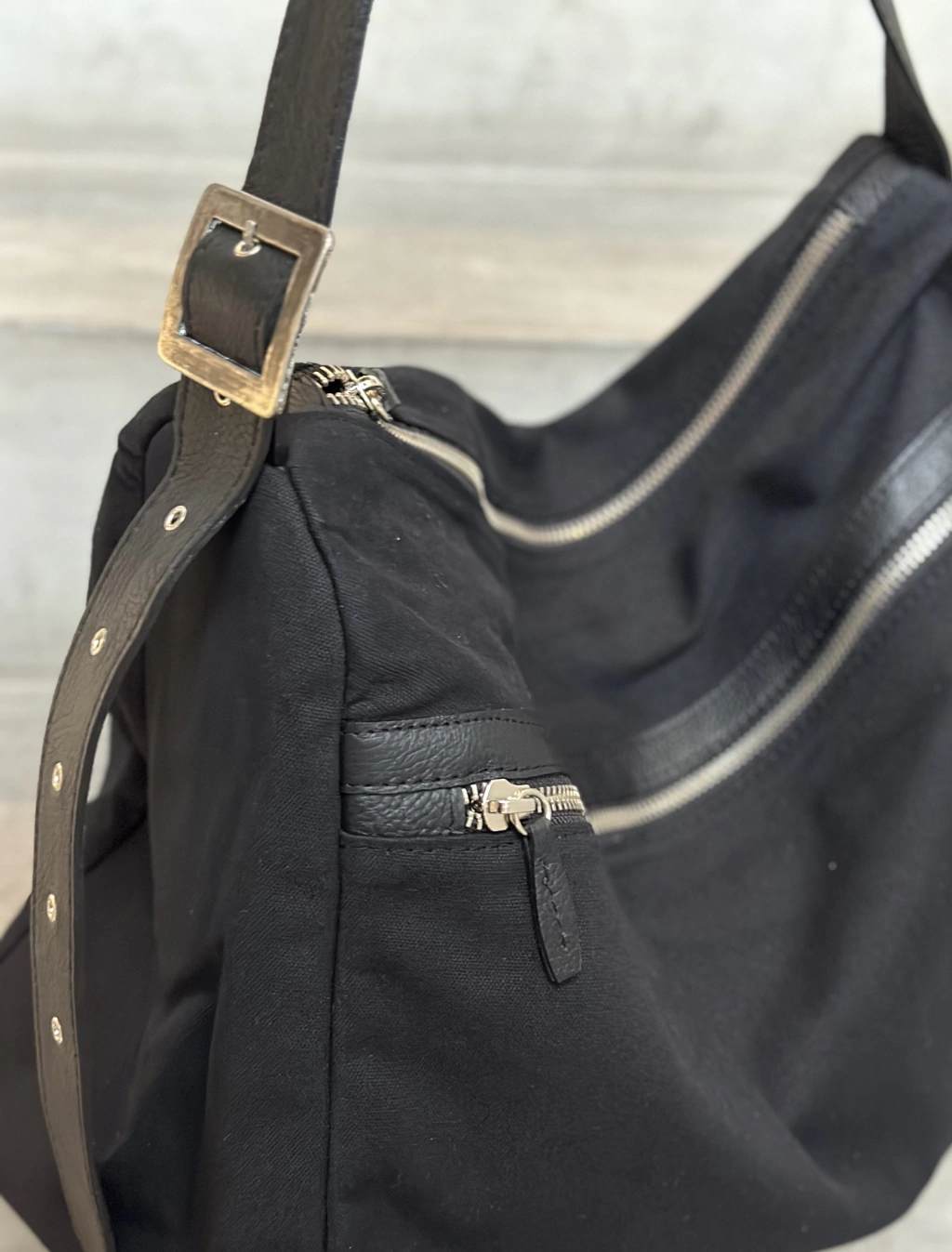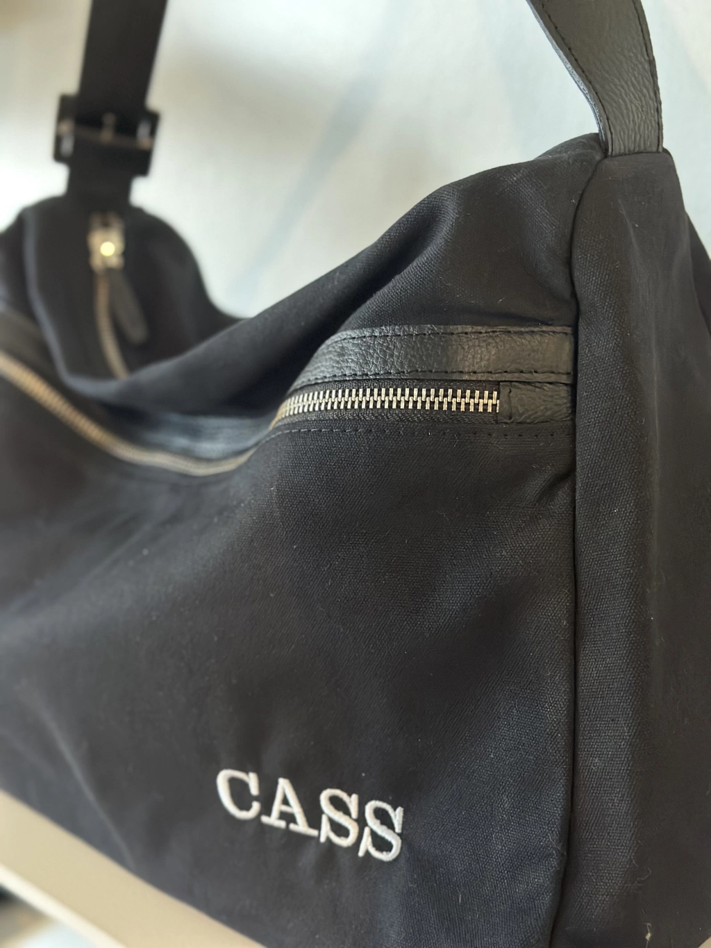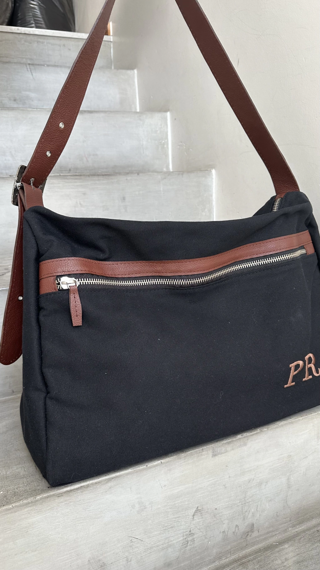 Es de lona , con detalles en cuero, cierre y hebilla metalica permitiendo hacer la manija regulable.