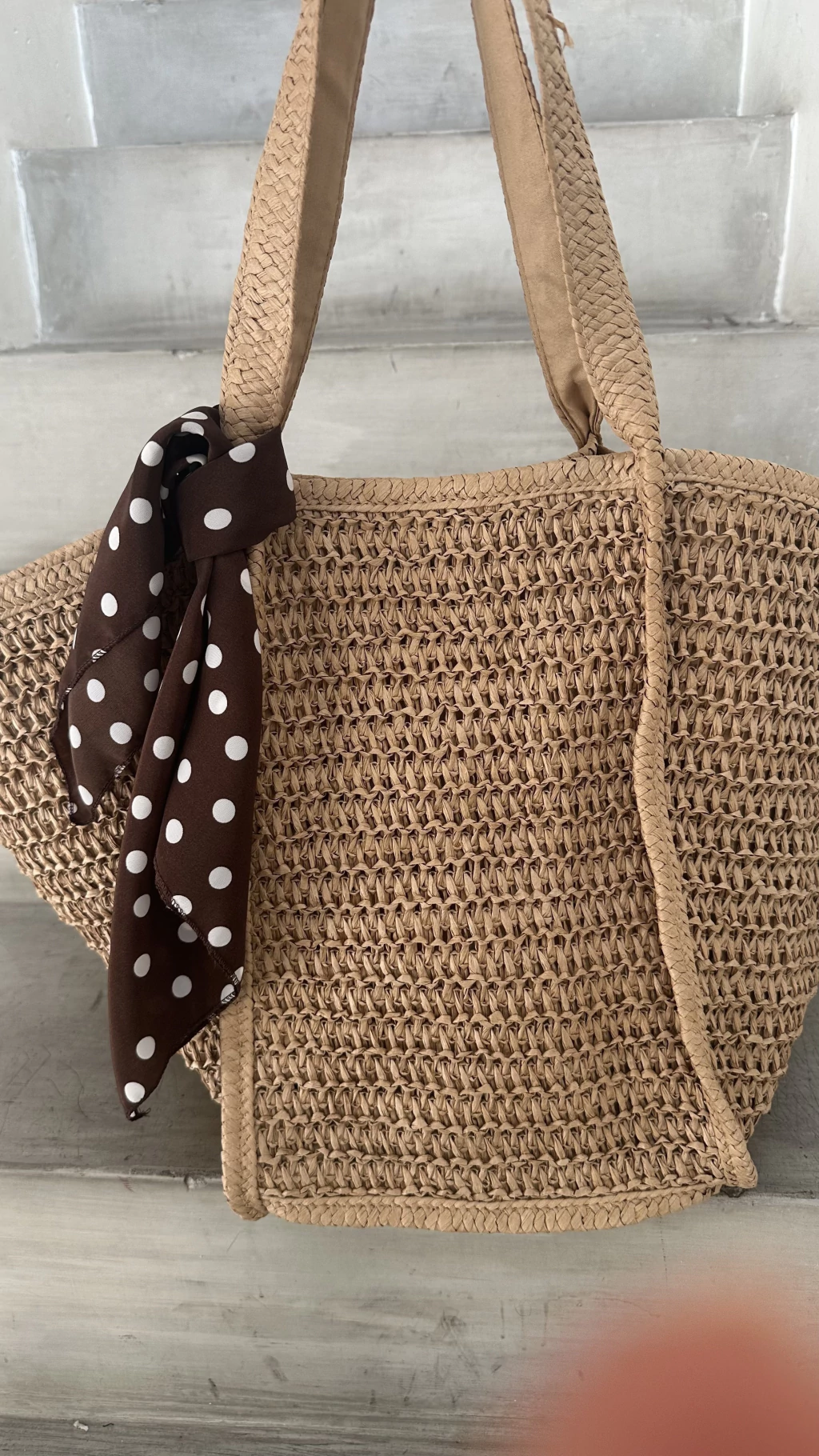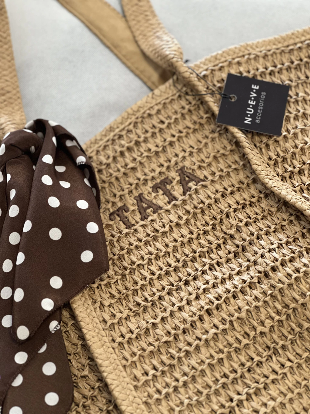El bolso iseal para llevar a todo lados , ideal para usar dia adia , y sino el mejor playero, picnic, ideal para llevar el mate , tiene un diseño mas veraniego e informal ya que esta realizado de entretjidos de hilo de arroz. Es liviano, viene con pañuelo de lunares incluido . Es forrado, cierra con broche magnetico y tiene un bolsillo interior. La base es grande y le da mucha capacidad . Podes personalizarlo con maximo 5 letras bordadas