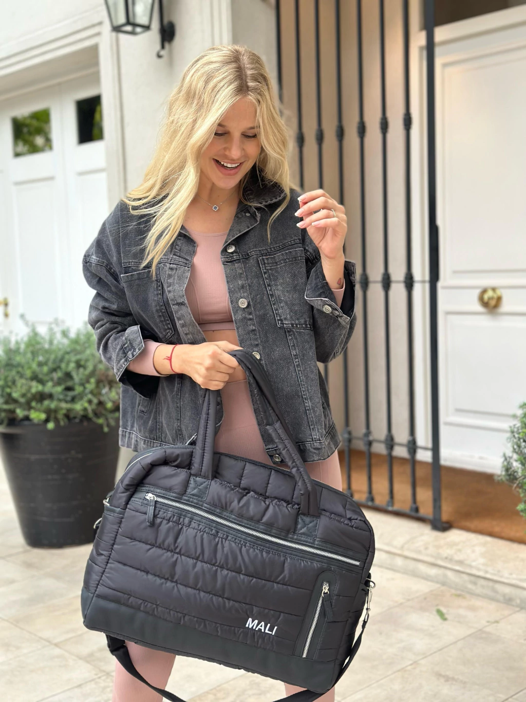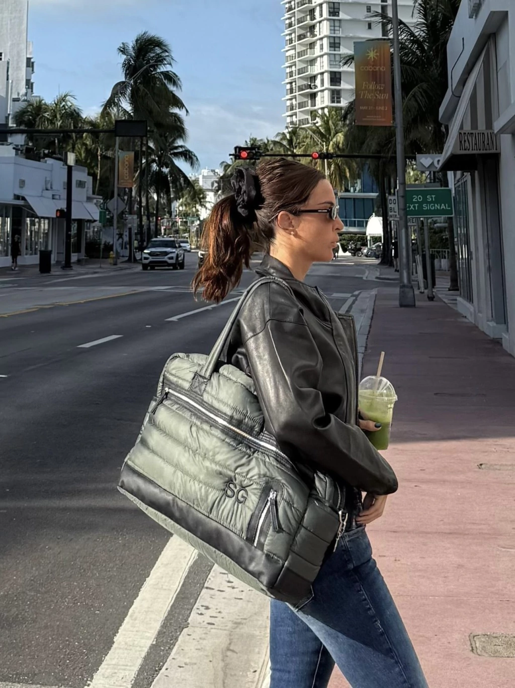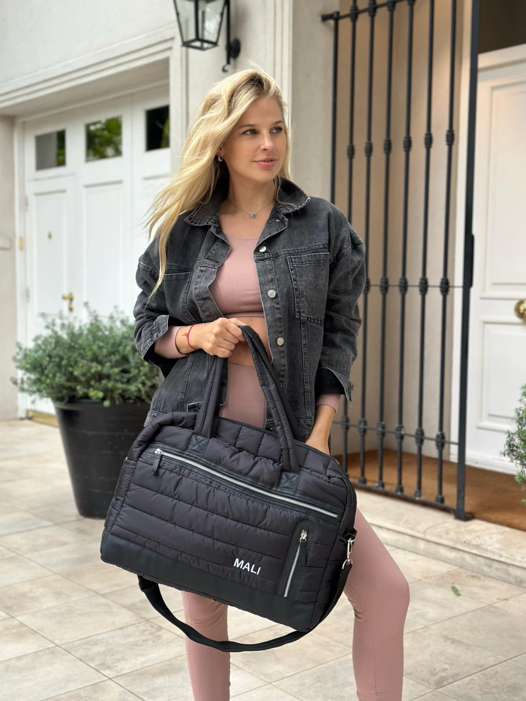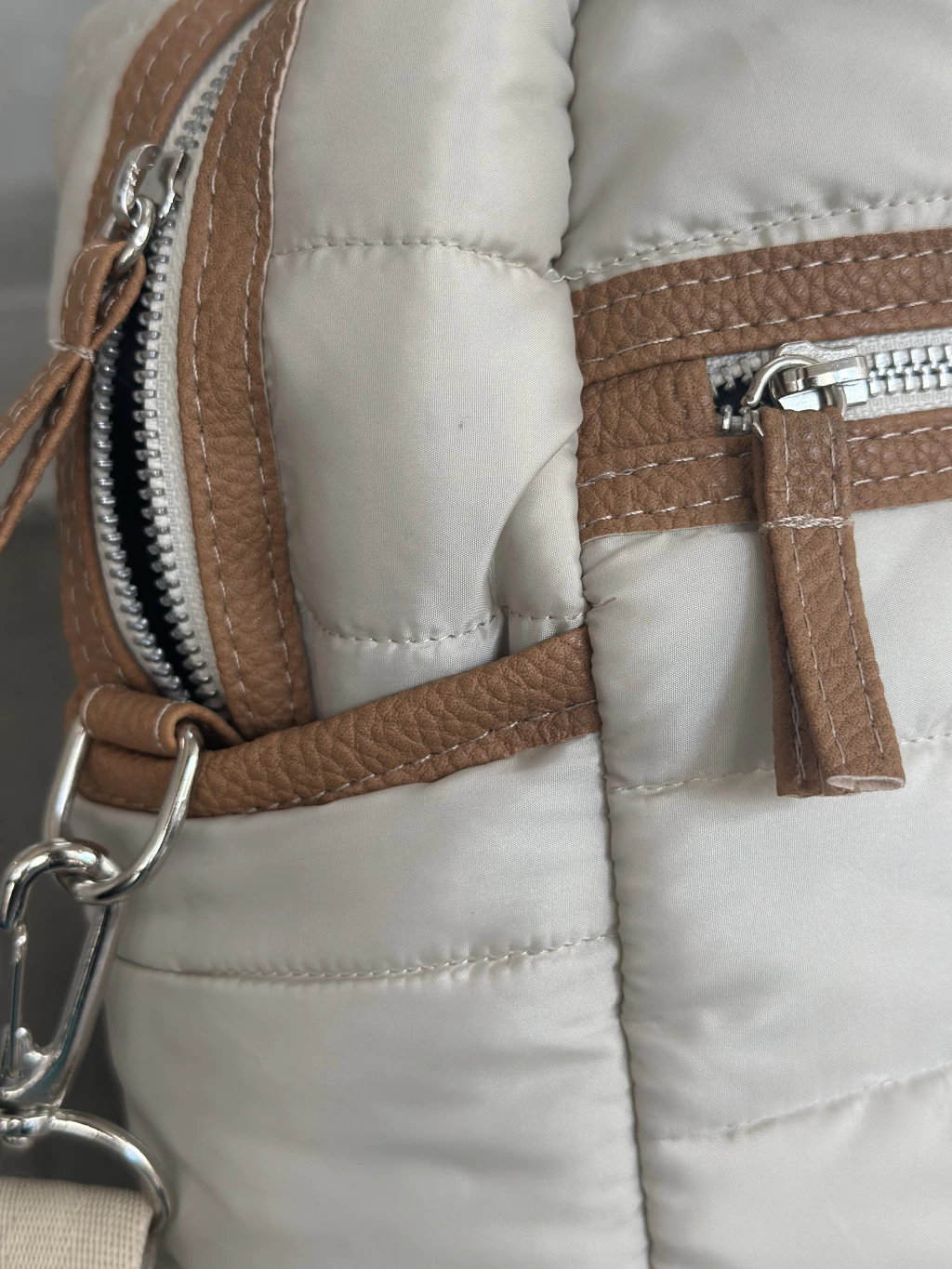 es de tela impermeable matelaseada, los detalles son de cuero ecologico, cierres metalicos y forrado impermeable.