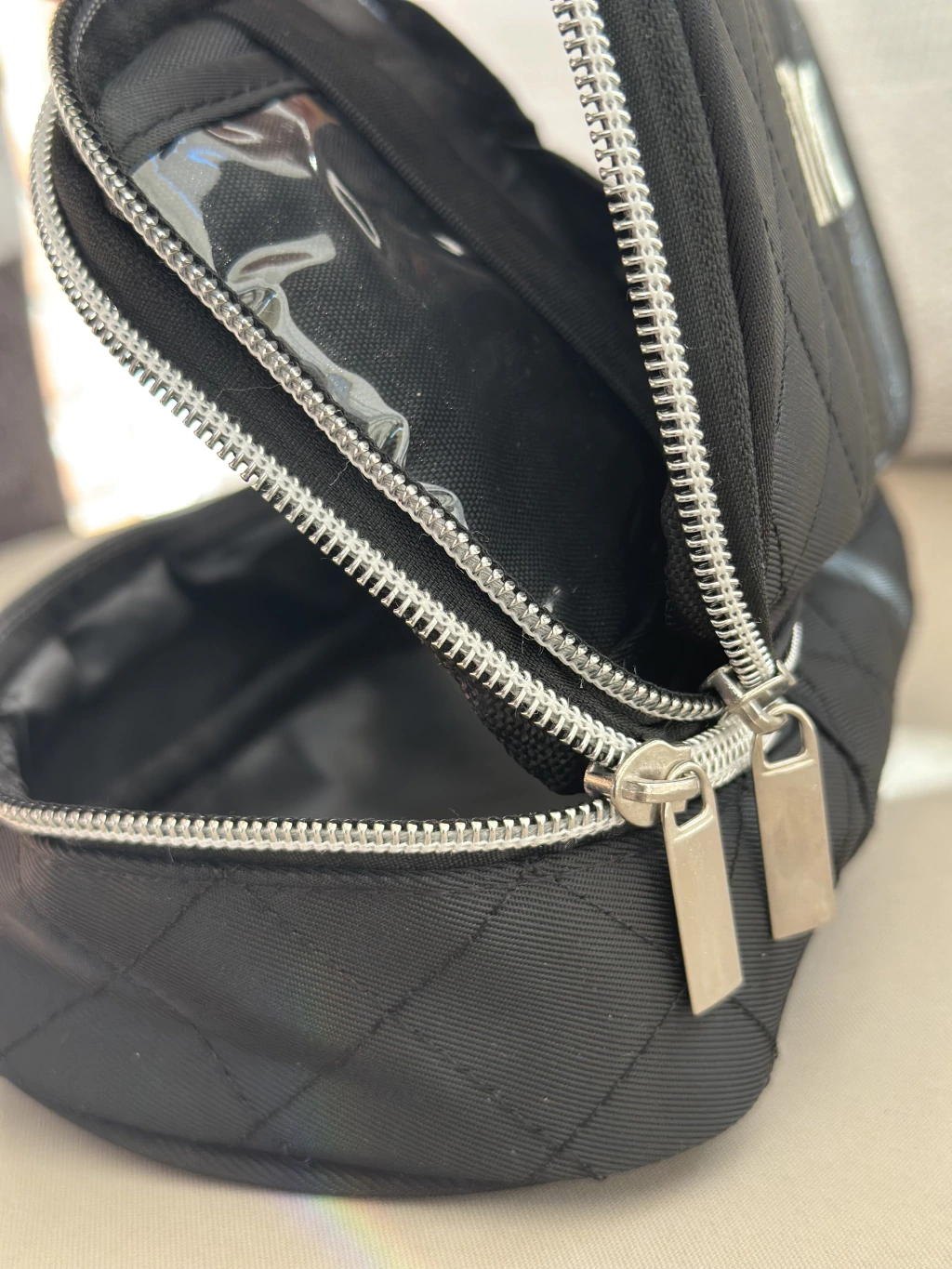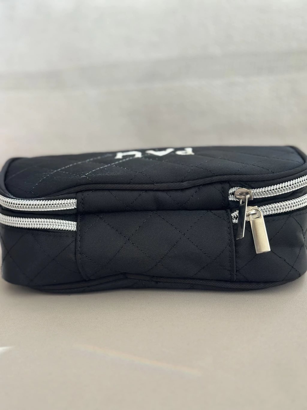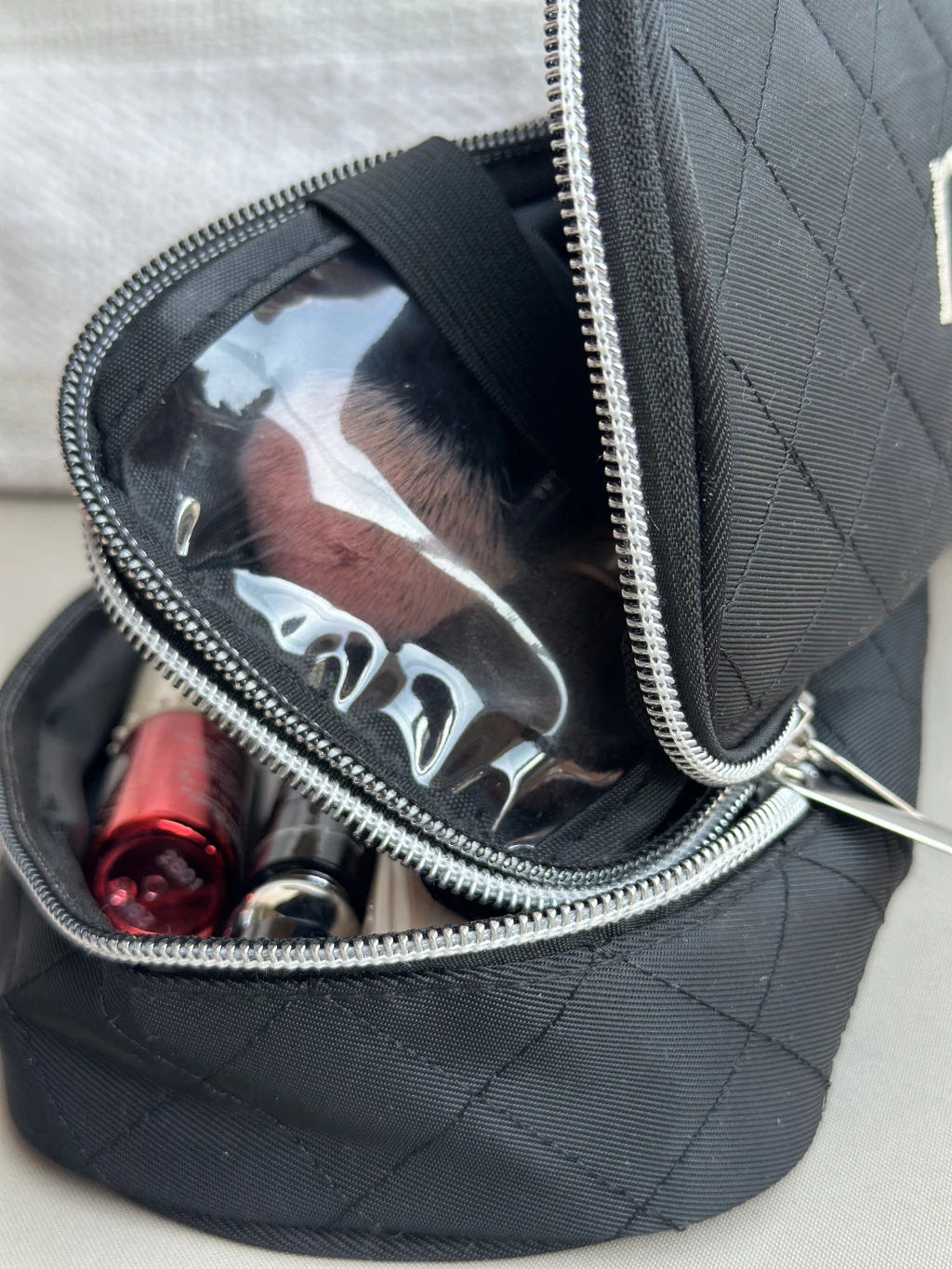 Portacosméticos matelaseado forrado con mucha capacidad y diseño inteligente. Cuenta con doble compartimento: uno profundo ideal para maquillaje o elementos personales como biromes, y otro superior con bolsillo con cierre y separadores para brochas.