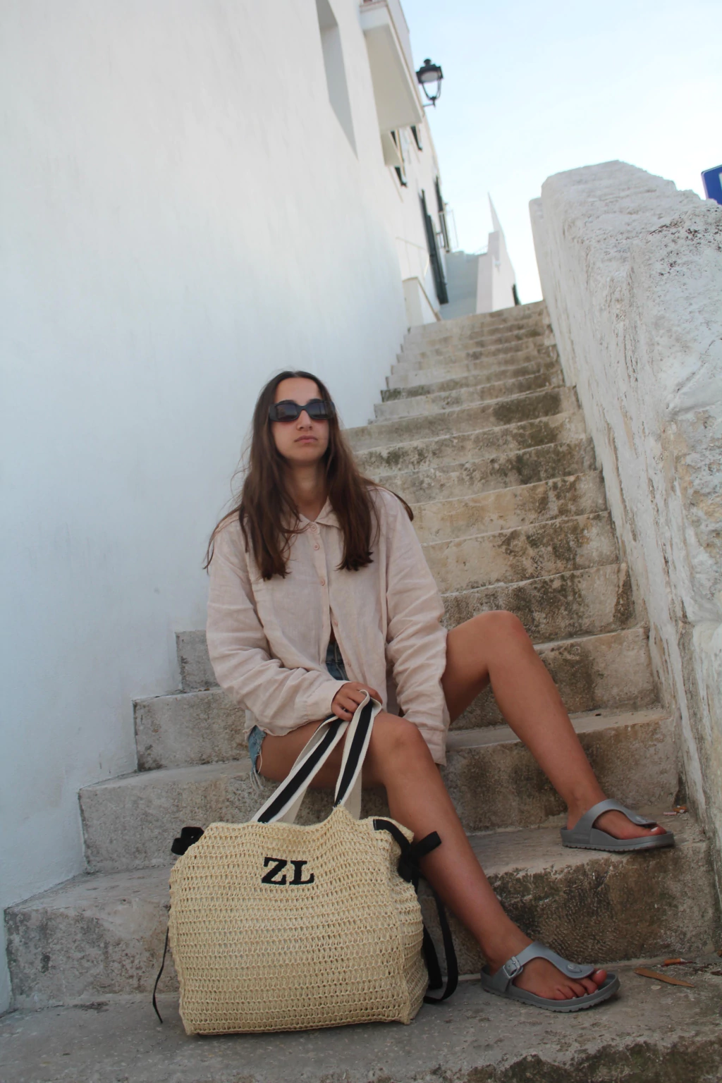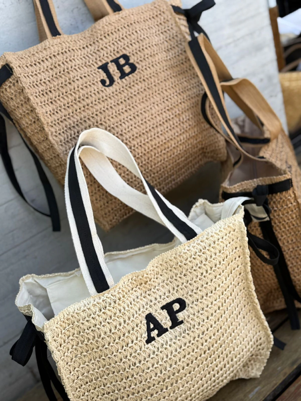 Ideal para la playa, el campo picnic o tus salidas diarias ya que podes cargarle dese la compu hasta el mate ! es Practica liviana y tiene onda . Los lazos de cinta negra a cada lado, forman moños, y podés personalizarla con hasta 5 letras bordadas, haciendo cada bolso único.